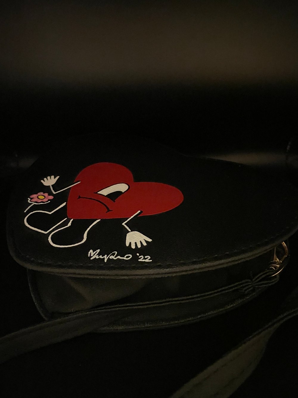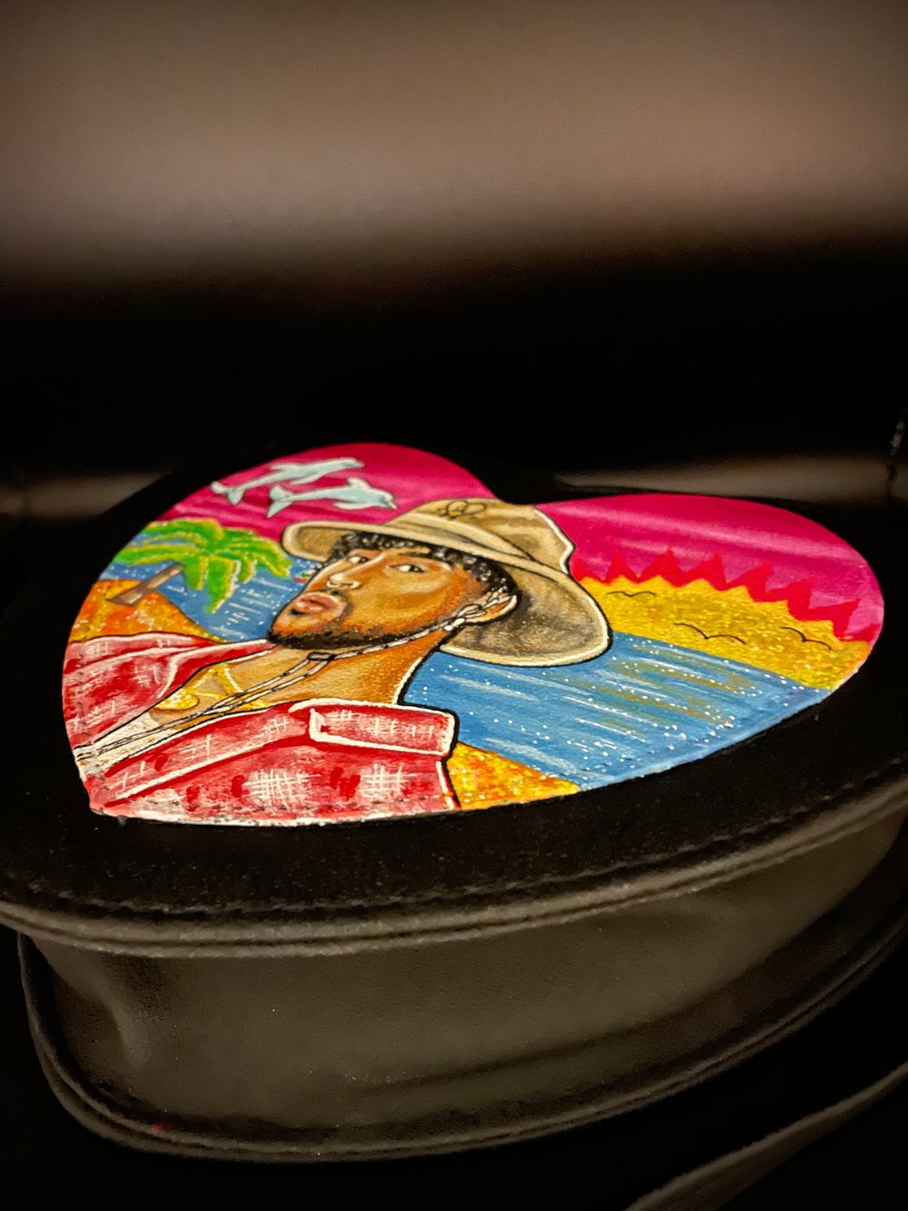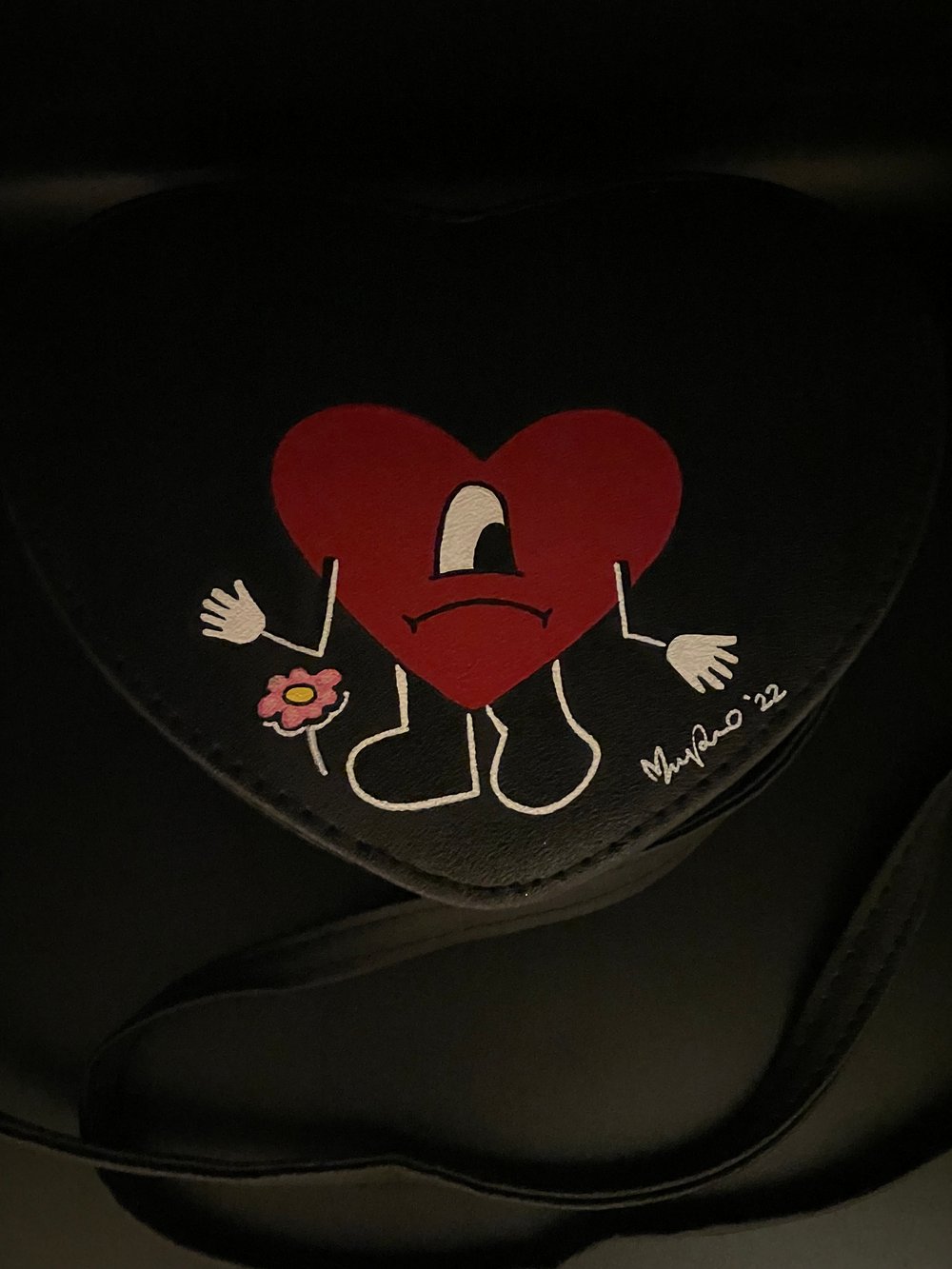 Hand Painted Heart Purse of Bad Bunny by artist Monica Robledo. This purse is faux leather and measures roughly 8"x7"x2".