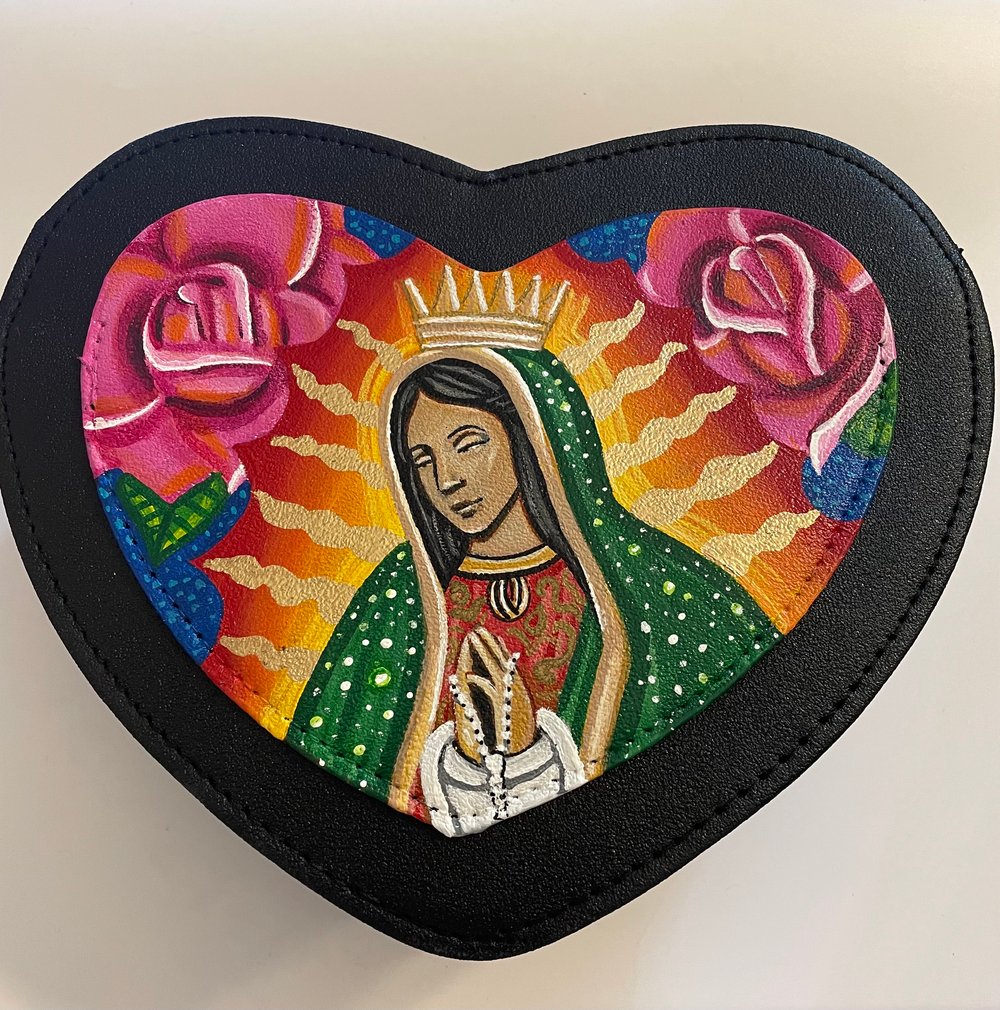 Hand Painted Heart Purse of La Virgen de Guadalupe by artist Monica Robledo. This purse is faux leather and measures roughly 8"x7"x2".